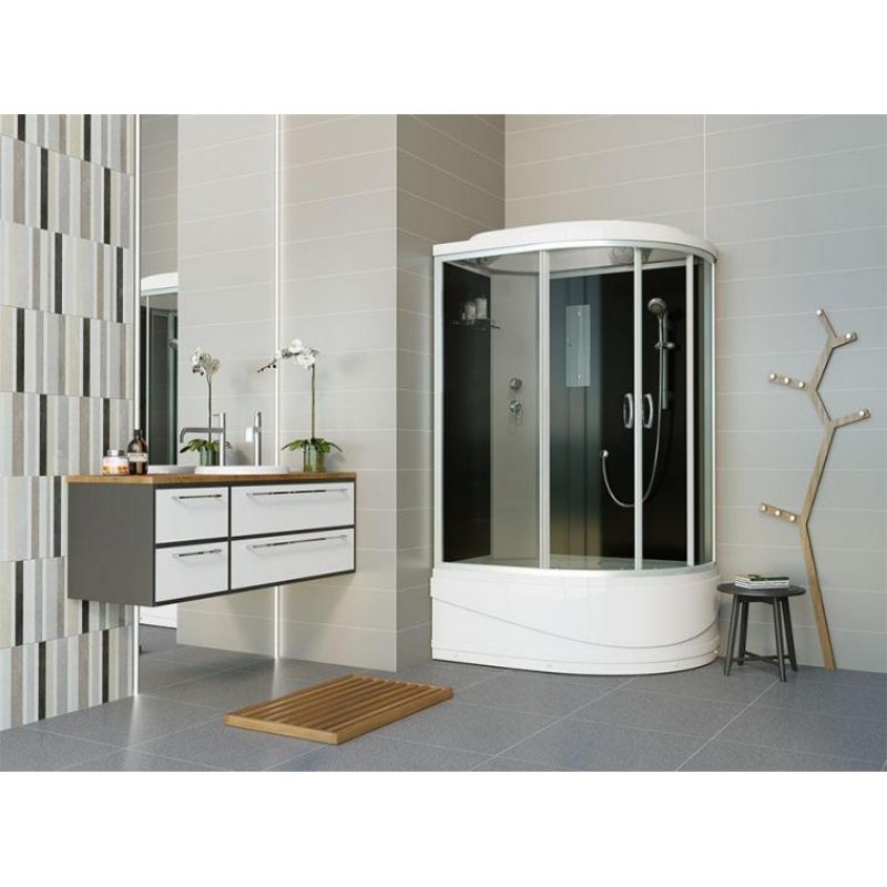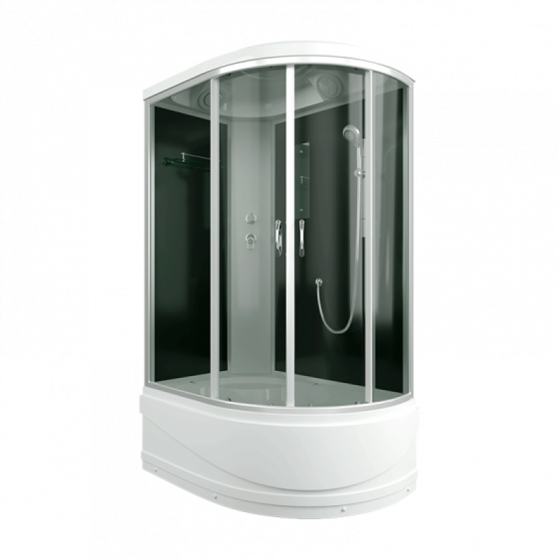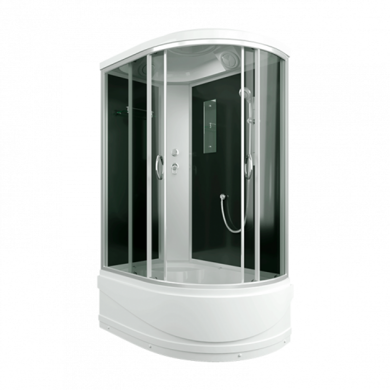 Тропический душ, ручной душ, зеркало, полочка. Задняя стенка -черная, дверцы - тонированные.
