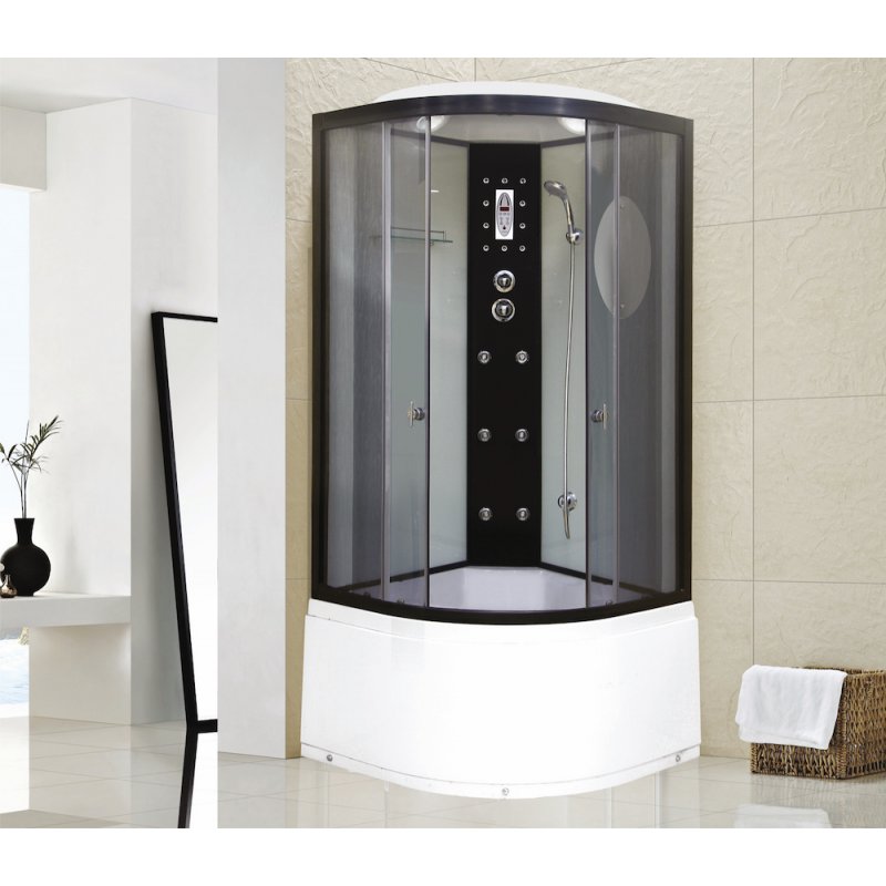 Поддон акриловый высокий, сифон, каркас, каленое стекло, полочка, зеркало, гидромассаж 6 форсунок, подсветка, верхний душ, ручной душ, вентиляция, динамик, пульт.