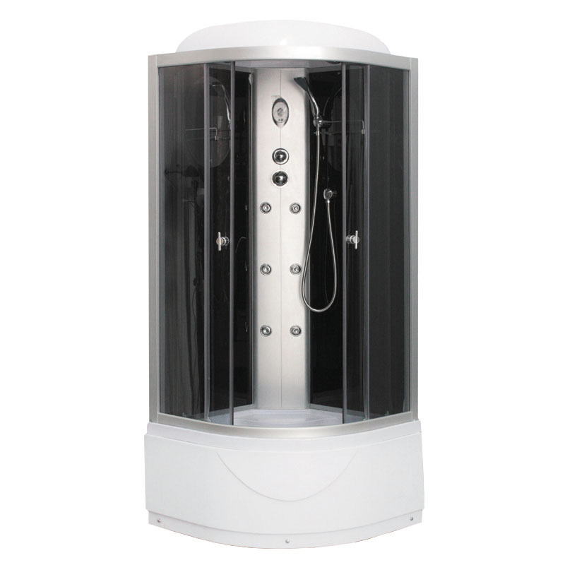 ГИДРОМАССАЖНАЯ ДУШЕВАЯ КАБИНА, передние шторки из закаленного безопасного стекла 4 мм (тонированное), с аллюмин. профилями(мат. хром), задняя стеклянная стенка из 3-х частей(2-ве боковые + центр. колонна), центр. гидромассажная колонна с 6-ю г/м форсунками, смесителем, электр. дисплеем( функции: радио, свет, вытяжка, вкл/выкл), поддон акриловый на металлическом каркасе с регулируемыми ножками, со съёмной фронт. панелью, и сливом, крыша акриловая с верх. душем, динамиком, вентилятором, и светильником, душевая лейка со шлангом на штанге, зеркало (кроме EW-32290G), стеклянная полка, ручки хром