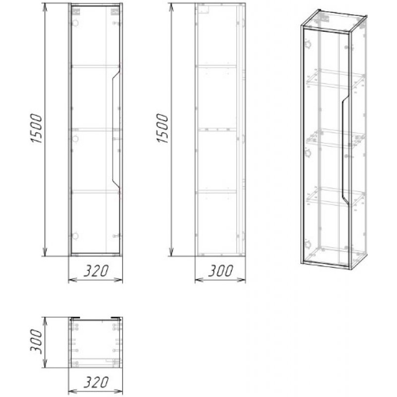 Внутреннее пространство пенала поделено полками на 4 секции. Дверь снабжена механизмом плавного закрывания.