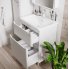 Тумба выполнена из влагостойкого МДФ покрытая белой глянцевой краской, устойчивая к перепадам температур и высокой влажности, крепится к стене.