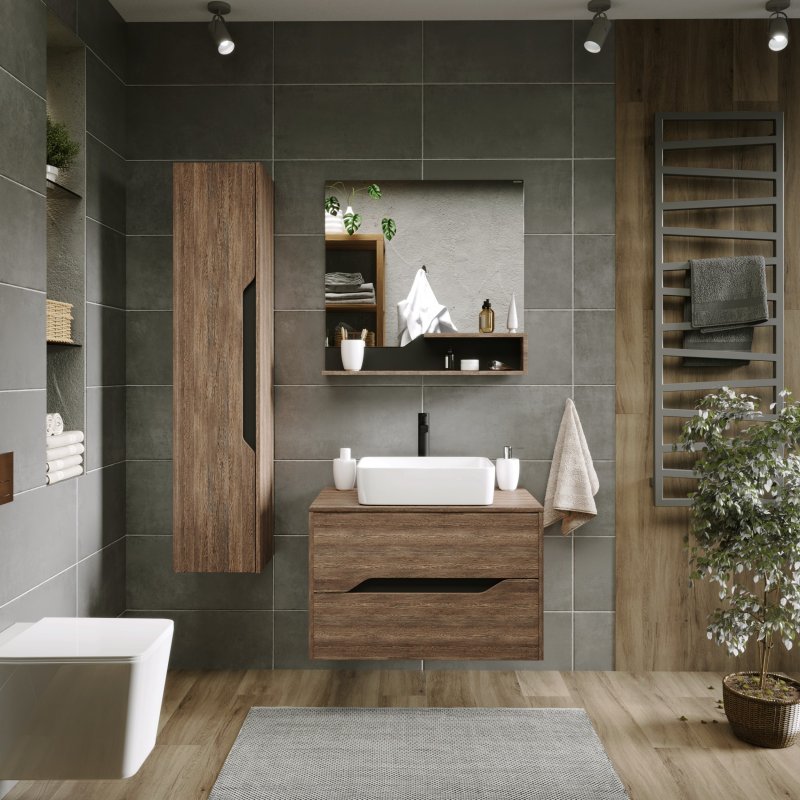 Тумба выполнена из влагостойких материалов устойчивых к перепадам температуры и высокой влажности. Корпус и фасады - МДФ в пленке винтажное дерево темное, вставки из ЛДСП графит. Тумба крепится к стене.